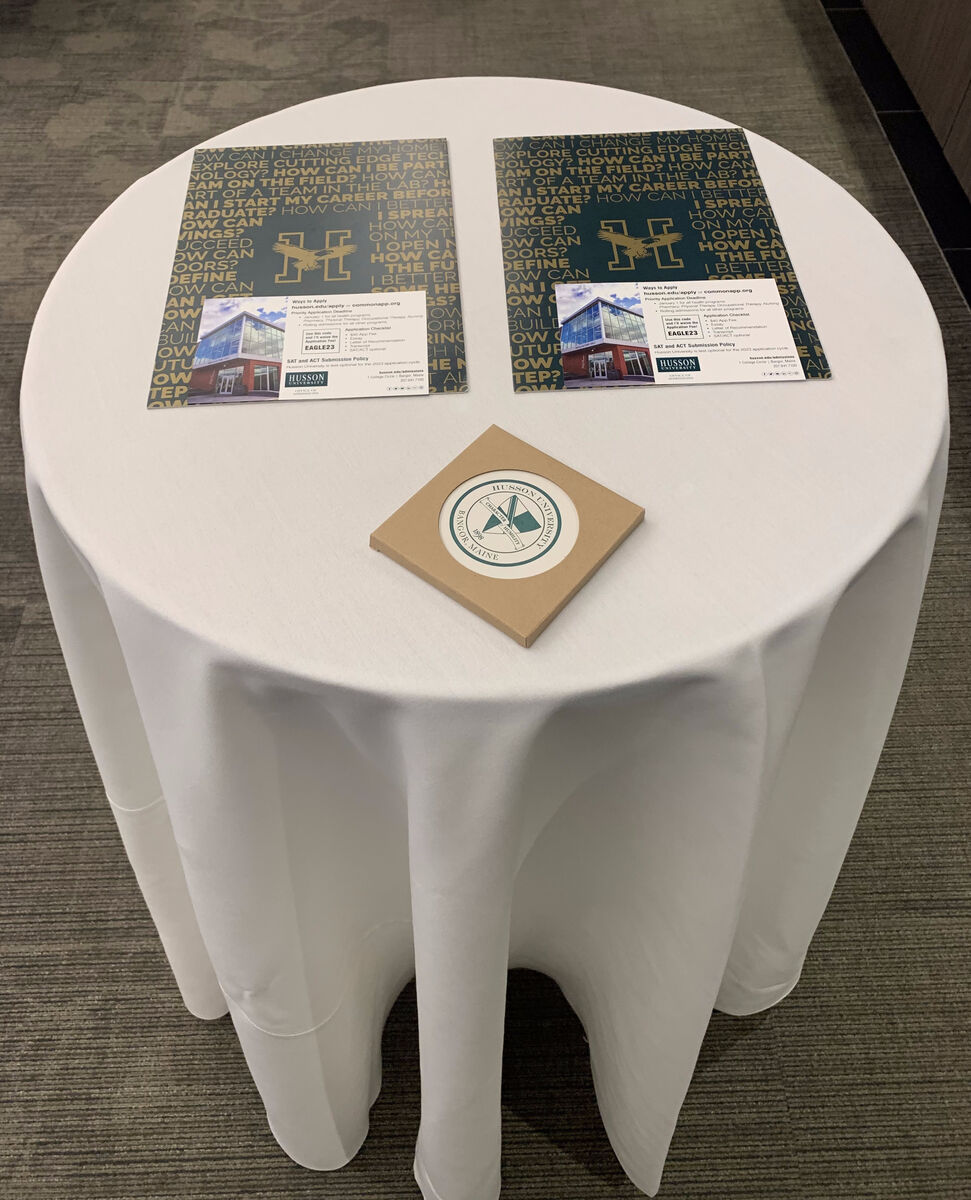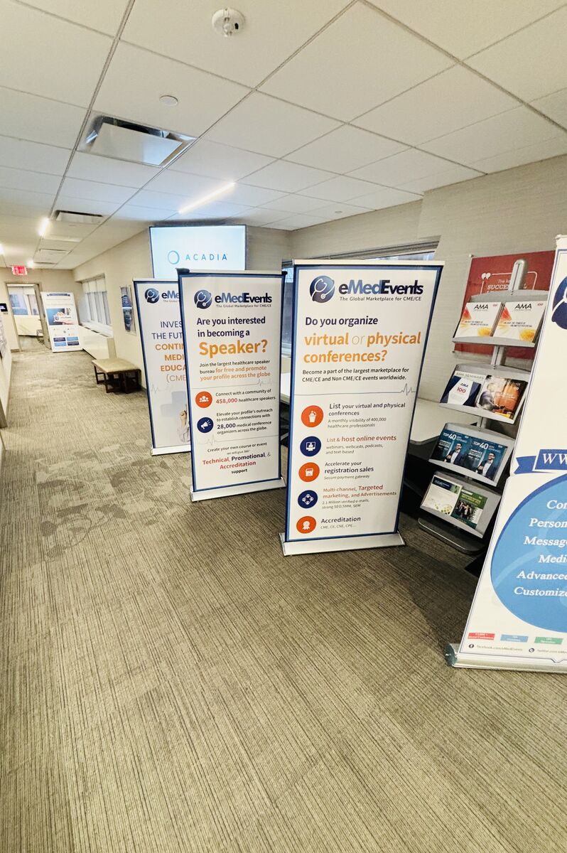 A comfortable lounge area with information stands, tables, and convenient seating, providing a welcoming space for guests to relax, network, or access event materials.